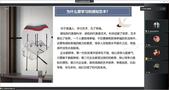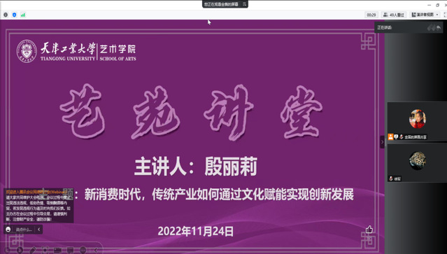 2022年11月24日晚19:00,“艺苑讲堂”首场学术讲座在腾讯会议举行,本北京融今文化发展有限公司创始人、CEO殷丽莉女士作了题为《新消费时代,传统产业如何通过文化赋能实现创新发展》的专题学术讲座。讲座由猎豹体育教学副经理徐军、公司党委副书记金笛主持,近200名员工参加。