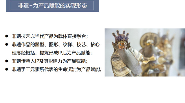 第四,要促进“非遗”和“非遗+”传统产业赋能。“非遗”作为现代生活的一种独特的艺术形式,是工匠精神与艺术的完美结合。正因如此,“非遗”的消费市场呈现出了独有的特点,通过“非遗+”促进传统产业体质增效,“非遗+”为传统产业注入文化基因、匠心品质;与“非遗+”融合创新,为传统产业带来新的用户、新的模式、新的场景。真正做到利用“非遗+”的方式为产品、企业、产业赋能。