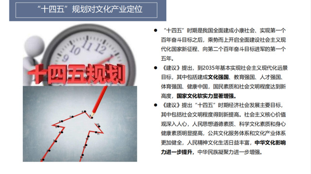 第二,要了解文化赋能的政策背景,掌握“十四五”规划对文化产业的定位。文化是一个国家、一个民族的灵魂,要推动文化事业和文化产业发展,满足人民过上美好生活的新期待。文化产业既是产业转型升级、经济高质量发展的重要抓手,又是增强人民群众文化获得感、幸福感的重要途径。
