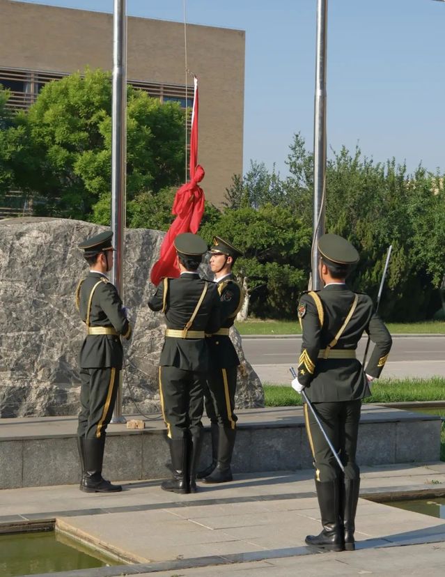 伴随着一声“升中华人民共和国国旗,奏唱中华人民共和国国歌”,同学们庄严肃立,目光紧紧追随着旗杆上的一抹赤色。升旗手振臂一挥,五星红旗徐徐升起,迎着初夏的一抹骄阳,随风飘荡。