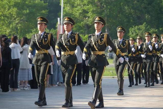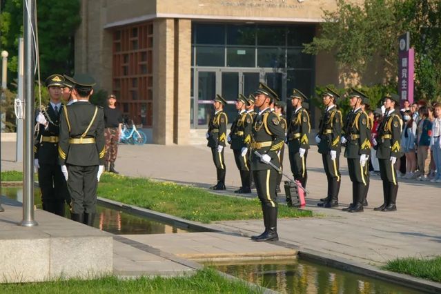 升旗仪式于上午七点准时开始。国旗护卫队的队员们目光如炬,气宇轩昂,迈着整齐的步伐,护送五星红旗入场。