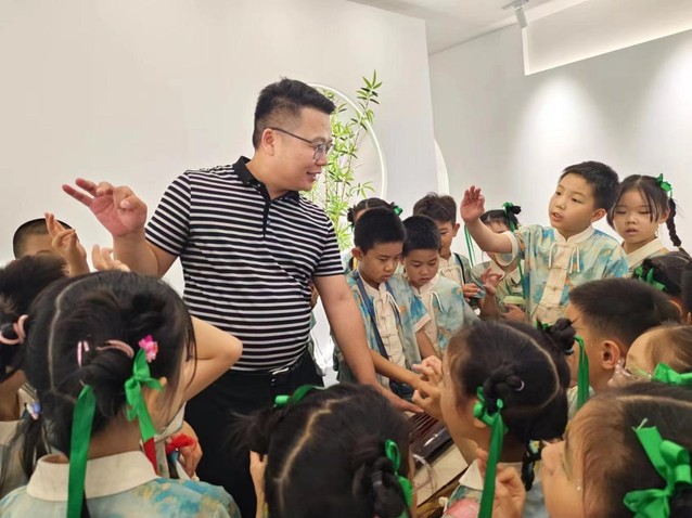 随后,小员工们又在漆陶艺术传承者郑勇老师的引导下参观了瑚琏学舍郑勇工作室,了解漆器的制作技艺和漆陶艺术,听取《岸上青莲》等器物设计的构思,小员工们被一个个精雕细琢的作品所震撼。