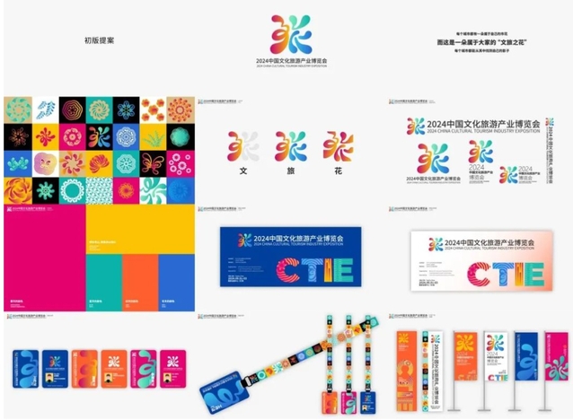 展会形象最初的设计思路由“旅”字展开,在用文字设计LOGO时需要考虑到文字的变形、尽可能地符号化以及除文字本身外其他意义的赋予,因此在经历诸多尝试后,最终将“文”字与“旅”字融合,同时采用圆角的形式进行笔画表现,使文字笔画产生如同花瓣绽放一般的感觉,也就赋予了它除却文字本身的其他意义——花朵的意义。再通过LOGO的演绎创造出多种多样的辅助图形,而每个辅助图形都呈现出不同的花朵样式,所以也就有了更大的理念“每一个城市都有一朵属于自己的市花,本标志也是一朵大家共同赋予的文旅之花”。