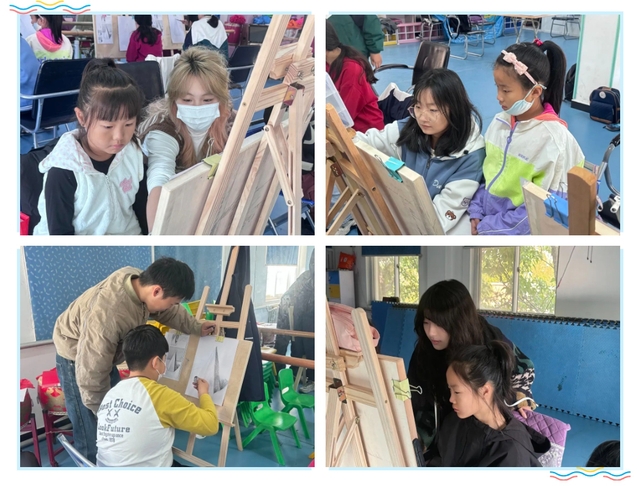 素描组繁星志愿者从简单的几何体开始,教小朋友学习基本的透视原理和结构画法,在教学过程中,注重鼓励和赞扬,让小朋友在轻松愉快的氛围中不断进步。同时,志愿者们根据小朋友的实际情况和兴趣点,灵活调整教学内容和方法,以达到最佳的教学效果。